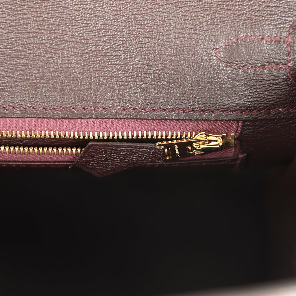 The interior is lined in Bordeaux chevre leather and has one zip pocket with Hermès engraved pull; pocket on opposite side.