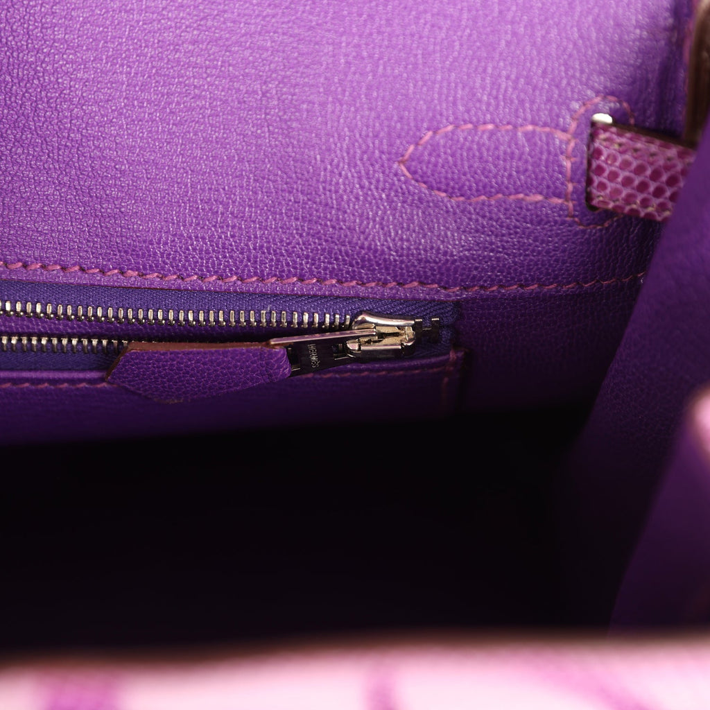 This Birkin is in Violet Varanus Niloticus Lizard leather with palladium hardware and has tonal stitching, front strap, two straps with center toggle closure, clochette with lock and two keys and double rolled handles.