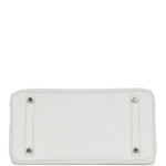 This Birkin is in White epsom leather with palladium hardware, tonal stitching, front flap with two straps, front toggle closure, clochette with lock and two keys, and double rolled handles