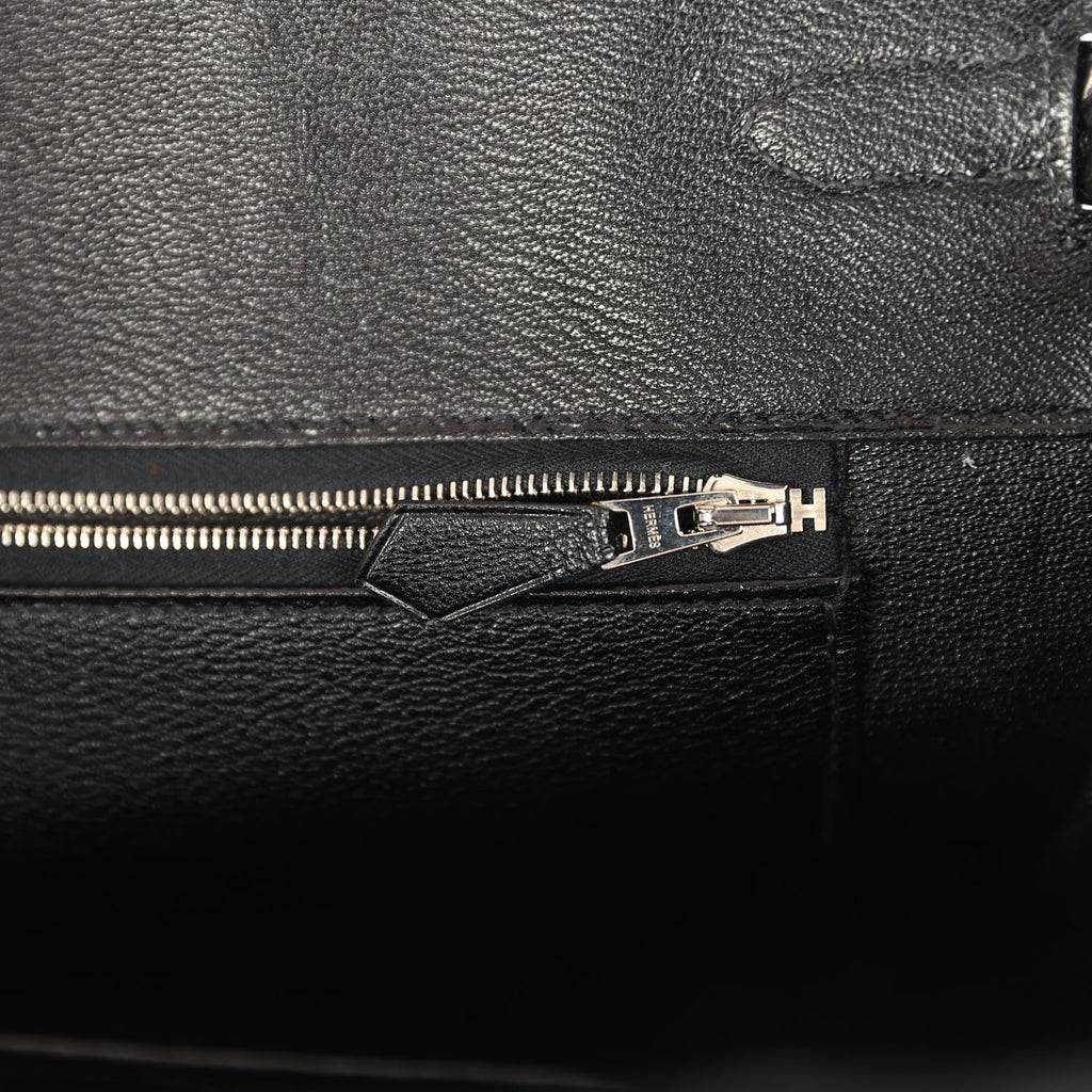 The interior is lined with Black chevre leather and has one zip pocket with an Hermès engraved zipper pull and an open pocket on the opposite side.