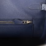 The interior is lined with Bleu Brighton chevre leather and has one zip pocket with an Hermès engraved zipper pull and an open pocket on the opposite side.