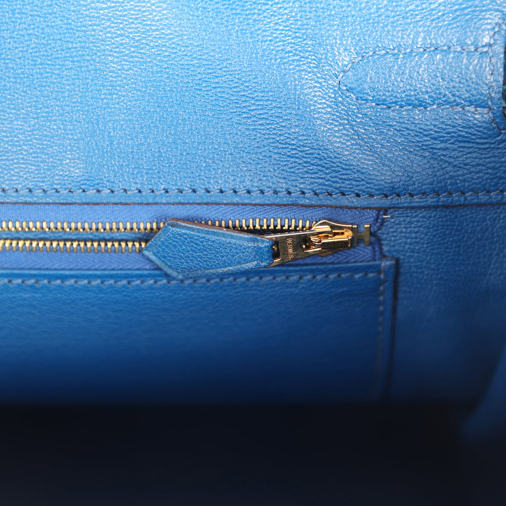 The interior is lined with Mykonos chevre leather and has one zip pocket with an Hermès engraved zipper pull and an open pocket on the opposite side.