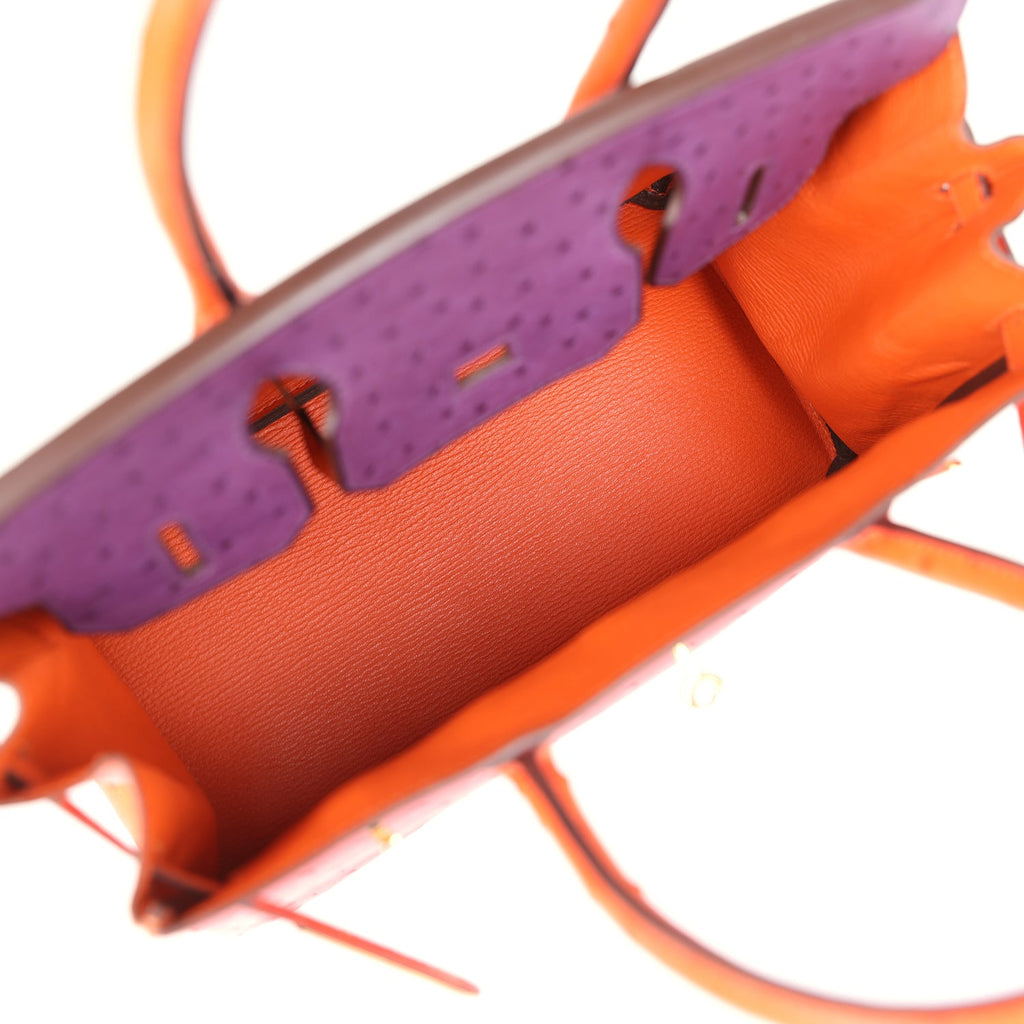 Home Hermès Exotic Handbags For Sale Pre-owned Hermès Special Order (HSS) Birkin 30 Tangerine, Violet and Bougainvillea Ostrich Gold Hardware